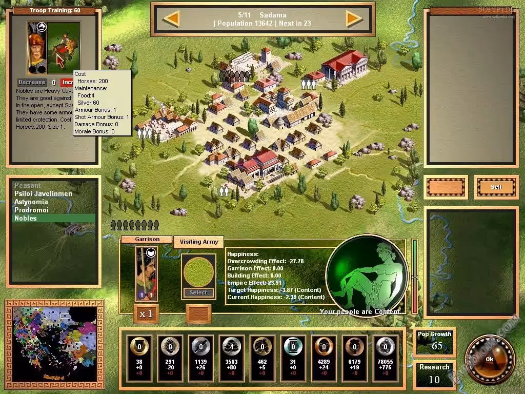 В игре Spartan вы можете играть не только за Спартанцев но и за Греков, Македонию, Афину, Коринф и другие страны древнего мира. Тренируйте солдат улучшайте им доспехи и оружие, не забывайте тренировать своих воинов на специальных тренировочных полях, ведь один отряд тренированный солдат может уничтожить несколько нетренированных. Игра хоть и по ходовая но сражения с анимацией, вы увидите какую ошибку вы допустили в выборе тактики атаки или обороны. Если вы сможете укрепить и защитить свои города думаю вам стоит начинать готовить армию для нападения, ведь чем больше у вас будет городов тем могущественнее будет ваша империя. Ресурсов в игре достаточна много: серебро, золото, дерево, камень, железо, медь, кирпич, мрамор, лошади, пшеница. Все эти ресурсы вам нужно будет добывать на территории свои городов.