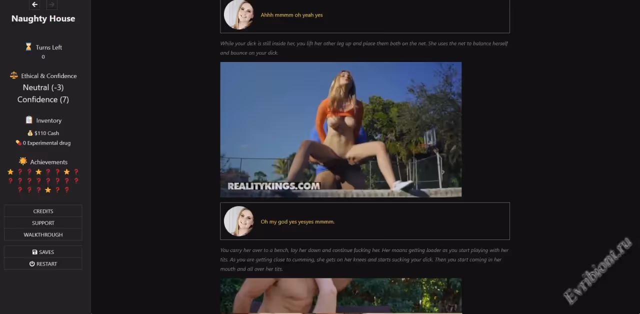 Naughty House – это интерактивная текстовая игра, где вы играете за врача, стремящегося сделать свою жизнь более захватывающей. От вас зависит выбор пути: карьерный рост или искушение следовать за желаниями. Вас ждут захватывающие сцены измены, пикантные анальные эпизоды и чувственные моменты с милфами. Исследуйте различные сценарии, открывайте неожиданные концовки и наслаждайтесь уникальными преимуществами на протяжении всей игры.