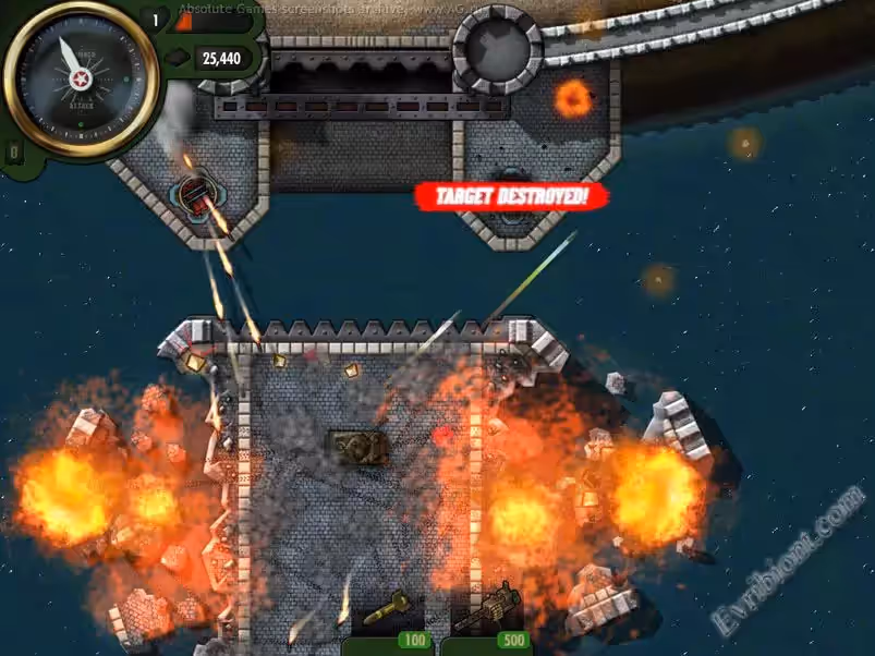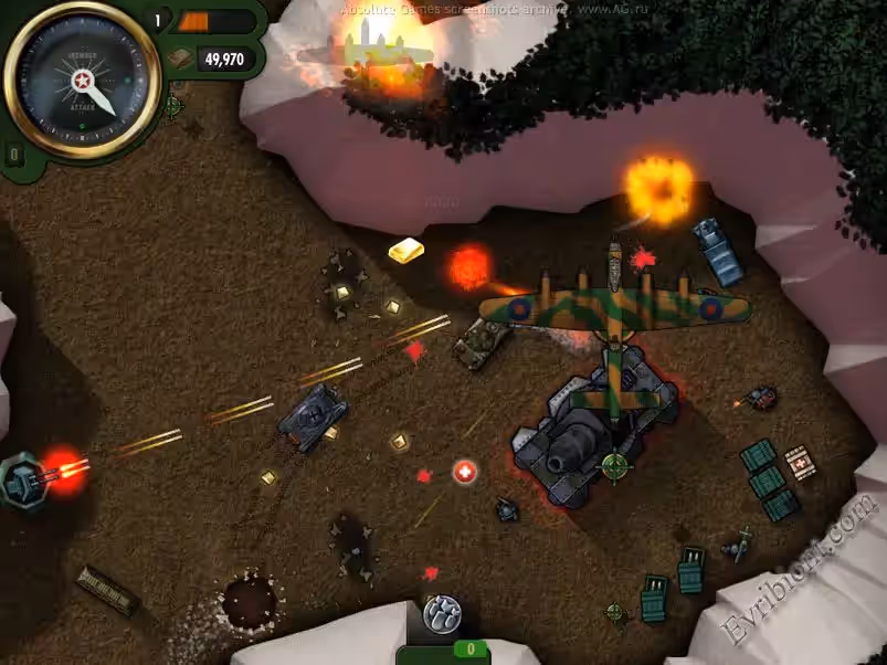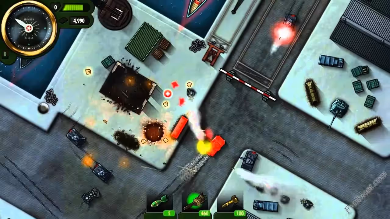 Настало время для войны. Вас ждут двадцать четыре миссии в каждой из которых огромная доза развлечения. Испытайте себя, разрушьте секретные объекты, военные аэродромы, а также расстреливайте толпы вражеских солдат, это все доступно в игре iBomber Attack. Вы можете улучшать свой танк используя различные боевые установки, к примеру пулемёты, ракетные установки, бомбы и другие оружия. Но это не так просто, вам необходимо накапливать золото и заслуживать очки победы. Гемплей очень даже прост но от этого игра не стала менее интересной. В игре хорошая графика и звук, от чего она стала только лучше.