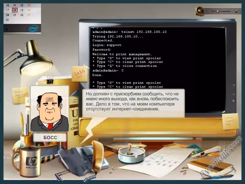 Это не просто игра а настоящий симулятор системного администратора, эту игру не сможет пройти обычный пользователь ПК, что там говорить, в эту игру обычный пользователь не сможет даже начать игру, из за того что перед запуском игры будет проведен контрольный вопрос для того чтобы начать игру мог только сисадмин. Игра сымитирует пространство системного администратора. Вам нужно будет выполнять самые разные задания от сотрудников фирмы, а также от самого босса. С каждым успешным завершением задания будет появляться новое, более сложное задание. Вы будете решать все задачи с помощью командной консоли и с помощью панели сети офиса. Игра понравится тем кто разбирается в системном администрировании или хотябы знает команды для консоли.
