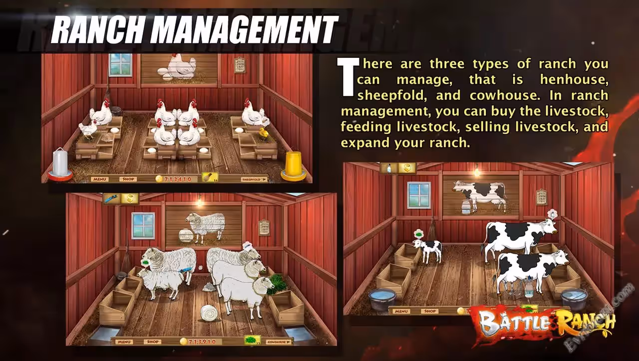 В Battle Ranch вас ждет ранчо на берегу моря, возле скал. На ранчо растут прекрасные фрукты и овощи, также там имеются и животные, такие как коровы, овцы куры. Однажды подплывает в вашим берегам корабль с злыми кабанами, они хотят похитить ваших животных.