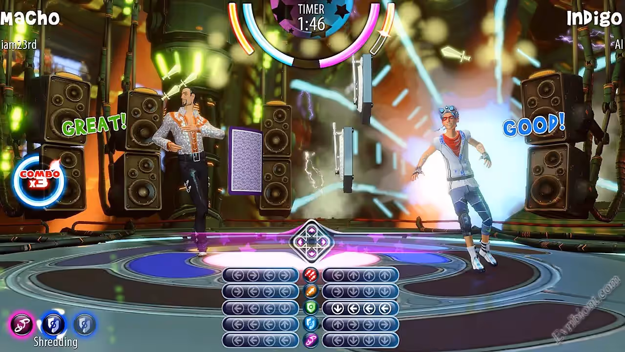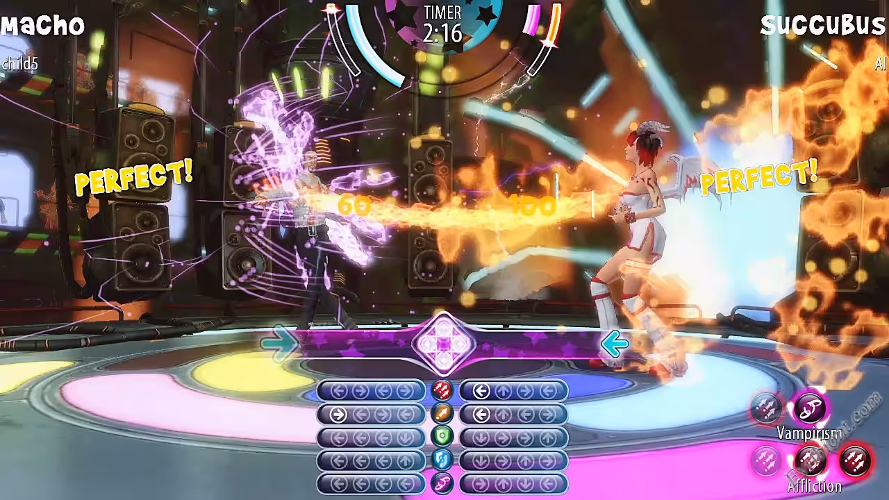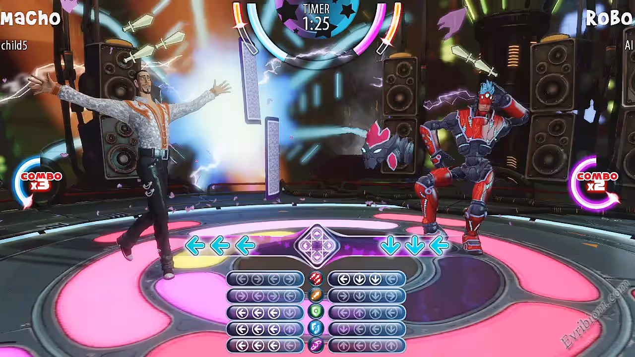 В Dance Magic вам уже в который раз нужно победить зло, но в этот раз вы это сделаете не мечем или топором, а с помощью энергии что выделяется во время танцев. Выберите себе персонажа по вкусу и настройте его внешний вид, а потом начинайте танцевальные дуэли. Подстраивайтесь под музыку, используйте защитные и атакующие движения.
