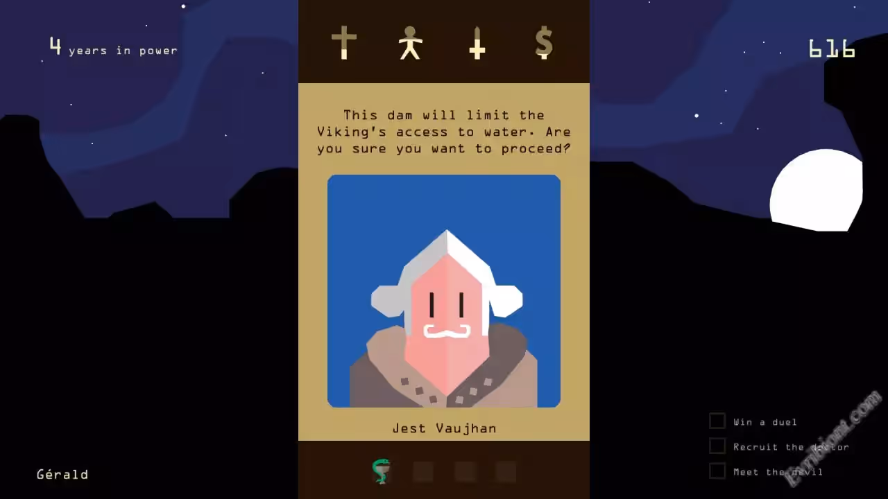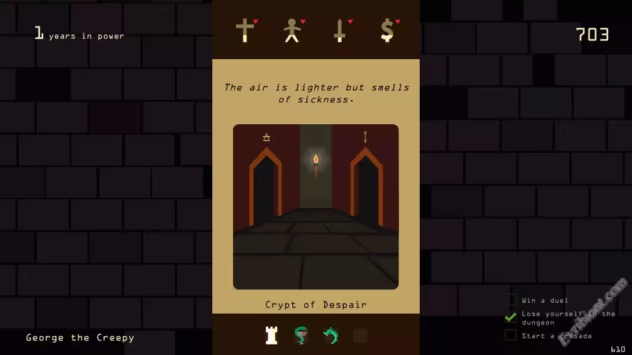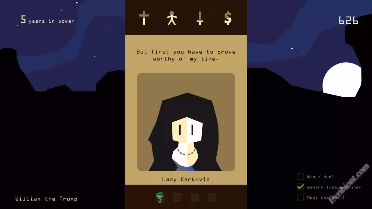Вам предстоит восседать на троне, вы будите принимать не легкие решения, которые будут иметь определенные последствия. Все ваши решения будут влиять на Религию, Жителей, Армию, Казну - именно на этих четырех столбах держится корона, если что либо из этих "столбов" упадет до ноля, то вы погибните и на ваше место придет новый король. Вас жду постоянные вопросы от советников, врагов, союзников, крестьян, вам стоит балансировать между всеми фракциями, иначе голова с плеч. Главное запомните, все ваши решения будут иметь последствия и вы рискуете не только собой но и всей вашей династией.