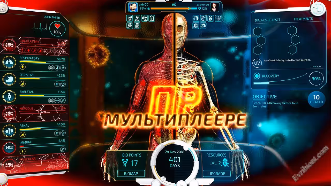 Bio Inc.: Redemption это игра, но она очень сложная и построена на биомедицинском симуляторе. В игре есть два режима, это "Жизнь" и "Смерть". В режиме "Жизни", вам необходимо будет определить болезнь, найти лекарство и не дать пациенту умереть. А вот в режиме "Смерть" все в точности да на оборот, вам нужно будет создать болезнь и сделать так чтобы человек умер. В игре Bio Inc.: Redemption больше шестисот реальных заболеваний с реальными симптомами, диагностикой, анализами... Игра очень реалистична и даже пугающая, с ней вы погрузитесь в мир микробов, бактерий и медицинских терминов.