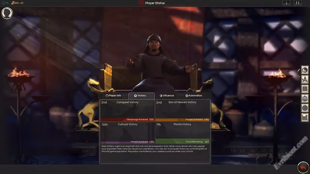В этой пошаговой стратегии вас ждет древний Восток, в те времена когда цивилизация известная как Китай, только зарождалась. Все начинается с небольшого племени или городка, именно начиная с ноля, вам нужно будет объединить различные территории в одну огромную империю. Расширяйте свои владения, захватывайте территории, нанимайте войска, стройте здания и развивайте поселения, превращая их в города. Не забывайте за культурное развитие и технологическое, а еще и религиозное. Действия игры будут происходить в красивейших местах - вас ждут горы, пустыни, луга и леса. Вы сможете отдалить обзор чтобы увидеть всю империю или на оборот приблизить, чтобы посмотреть как трудятся крестьяне.