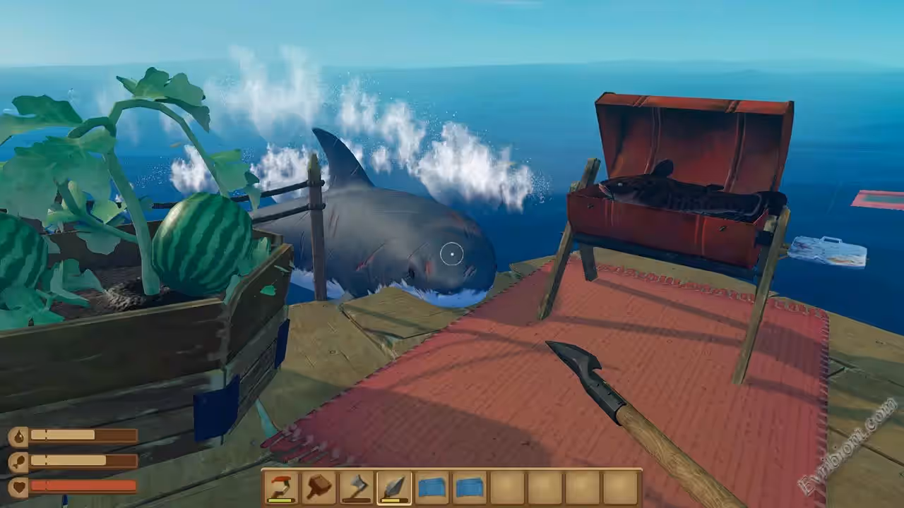 Что же делать если вы окажитесь на плоту посреди открытого океана? Ну если у вас есть крюк каким вы можете подтягивать различный мусор, который будете использовать для крафтов, то не все так плохо. Игра все время будет давать вам множество мусора, из него вы сможете сделать себе очень даже уютный плот. Придет время и вы на своем плавучем доме сможете выращивать даже пальмы. Но это все еще впереди, для начала нужно выжить и не дать себя сесть акулам.