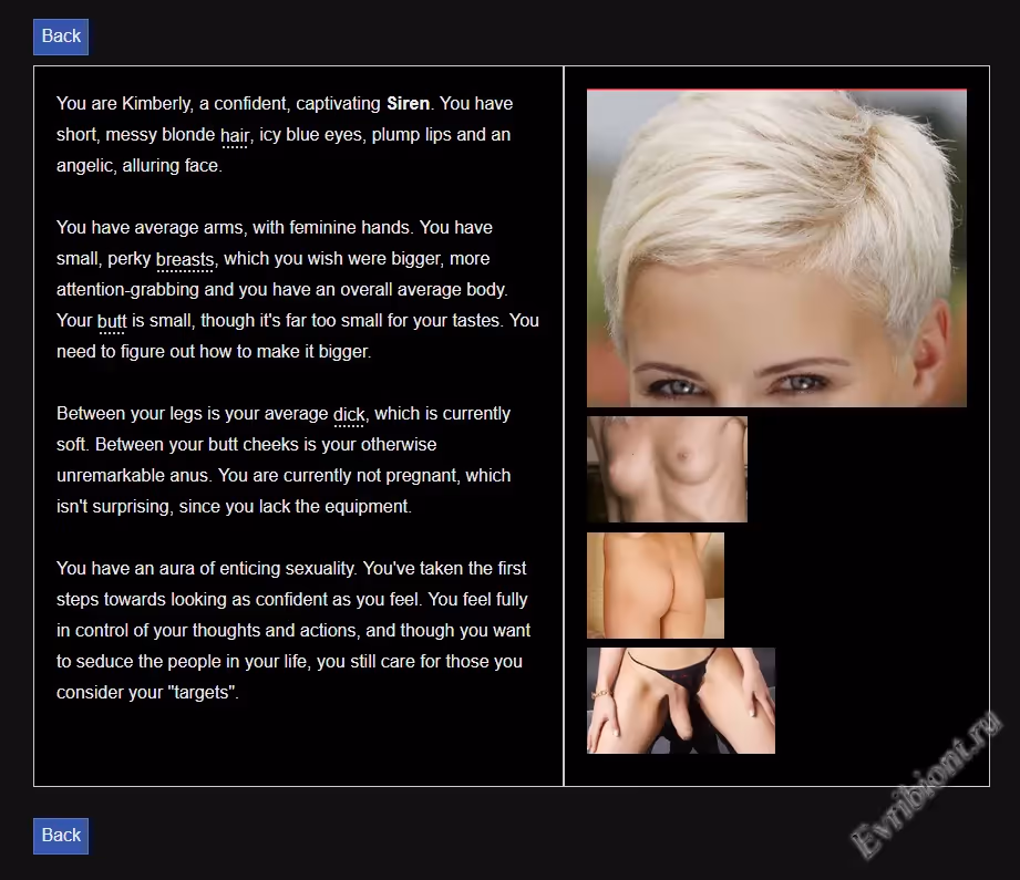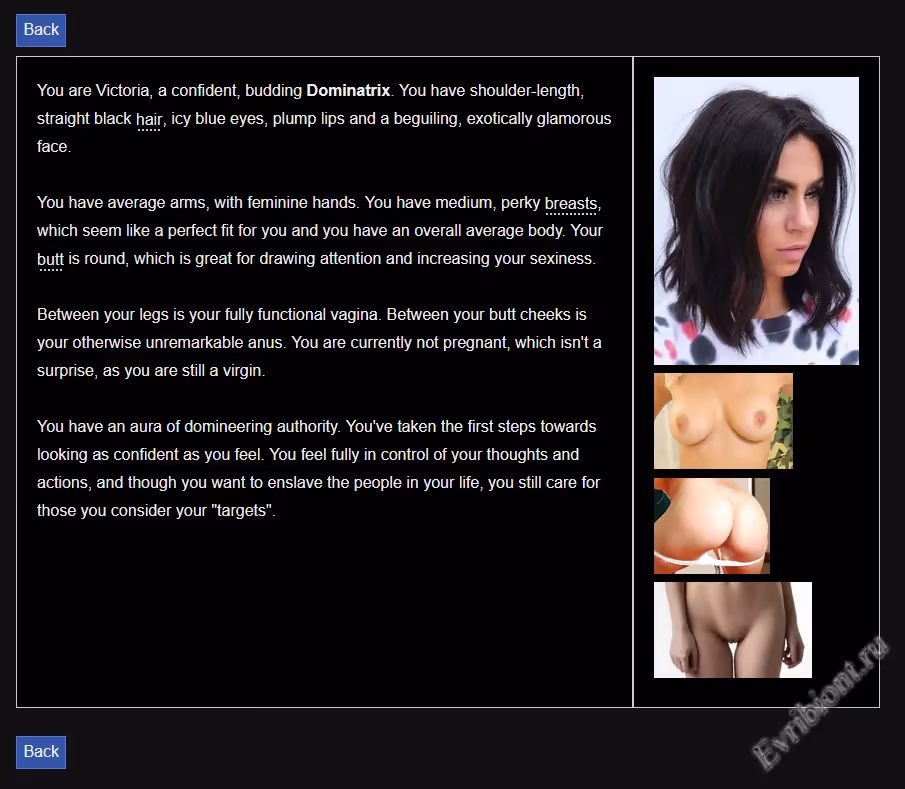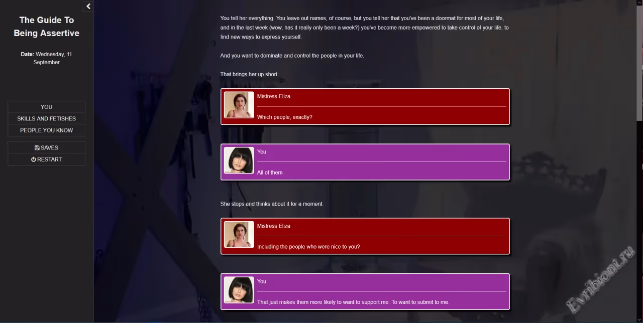 Погрузитесь в сюжет о трансформации личности, где главному герою предстоит пройти через череду сексуальных и ментальных испытаний, чтобы стать уверенным в себе мужчиной. На его пути — женское доминирование, бондаж, латекс, эксгибиционизм, а также сцены с участием беременных, главных героинь-женщин и реальных девушек в анимированных HTML сценах. Вас ждёт песочница с множеством интерактивных решений, сексуальных предпочтений и непредсказуемых поворотов.