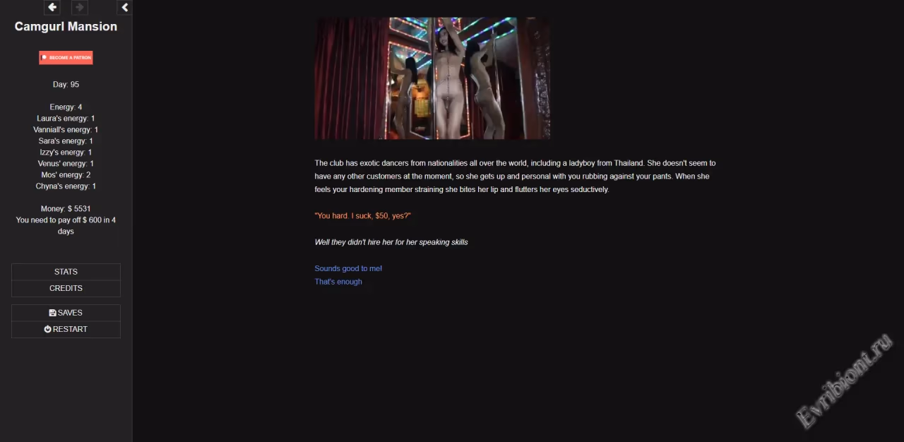 Борясь с долгами, вы делаете последние попытки улучшить свою жизнь. Ваша гениальная стратегия? Создайте безопасную среду для трансвеститок и поддерживайте их карьеру. Используете ли вы их, чтобы стать богатым? Создайте гарем для дикгерл? Вы позволите своему любопытству победить вас?
