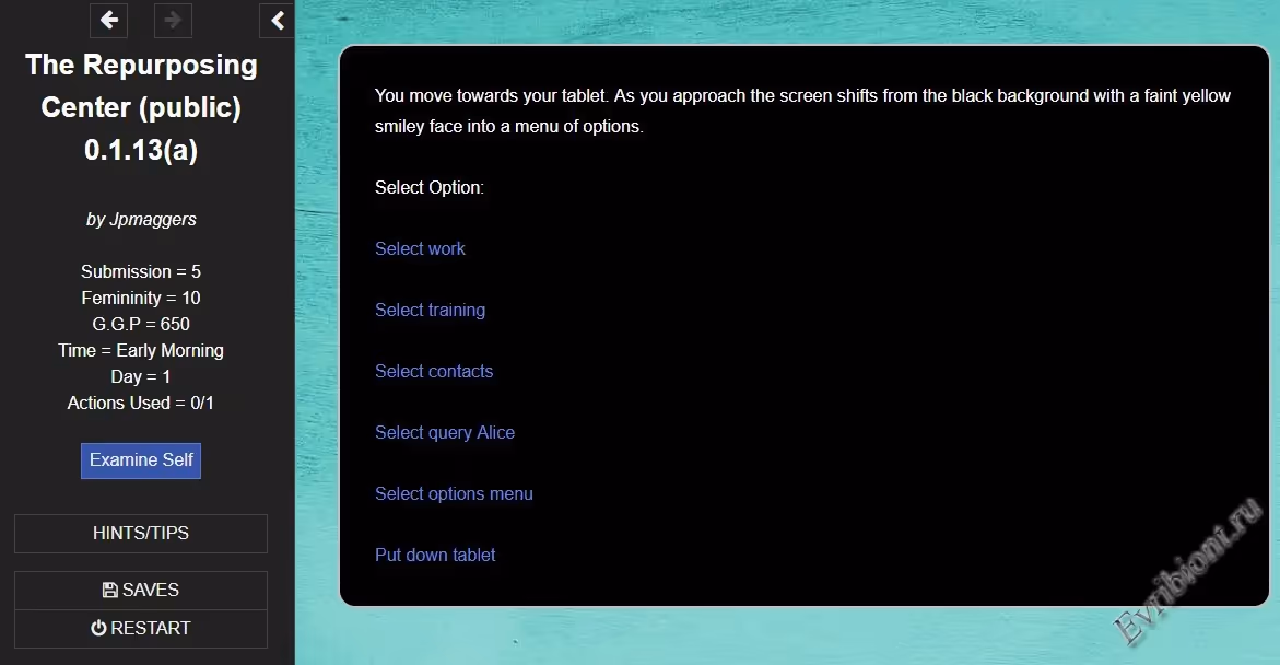 The Repurposing Center — провокационная порно игра HTML в жанре футуристической антиутопии, где вы попадаете в таинственный центр "перепрофилирования". В этом учреждении вас ждёт унижение, гипноз, бдсм, а также обязательная бимбофикация, брендирование и прочие трансформации, чтобы удовлетворить желания потенциальных покупателей. Здесь вы — товар, и ваша задача — найти путь к выживанию или подчинению.