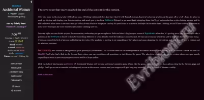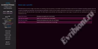 «Случайная женщина» — это интерактивная игра-симулятор фантастической жизни для взрослых. Она работает с большинством операционных систем и смартфонов, поскольку была создана в Twine Sugar cube. Вы играете в роли одинокого и безработного мужчины, который принимает предложение своего давнего друга переехать в изолированный городок Эппл-Три. Вы обнаруживаете, что полностью превратились в женщину в результате несчастного случая, и вам предстоит преодолеть многое, помимо простого перехода к жизни в маленьком городке.